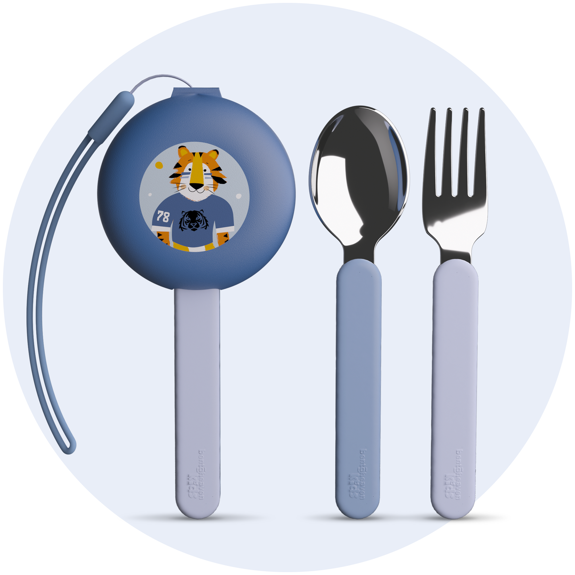 We created this set to empower independent eaters. The fork and spoon feature premium stainless steel heads and smoothly finished, BPA-free plastic handles that are perfectly weighted and sized for small hands to hold comfortably and safely.