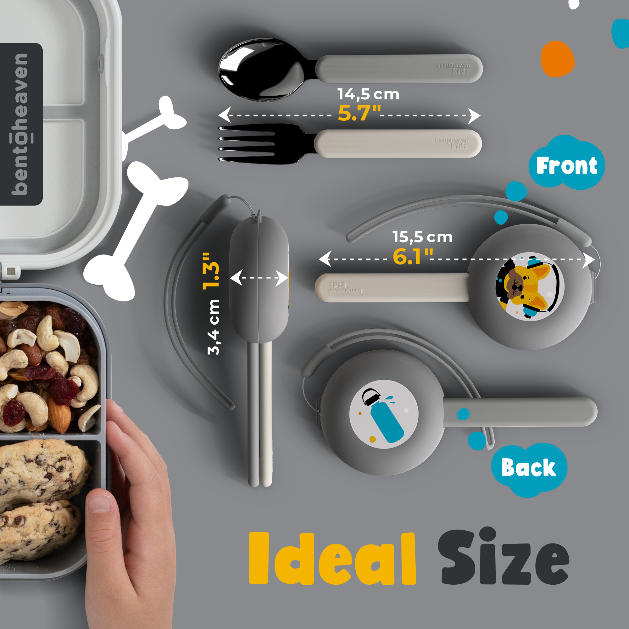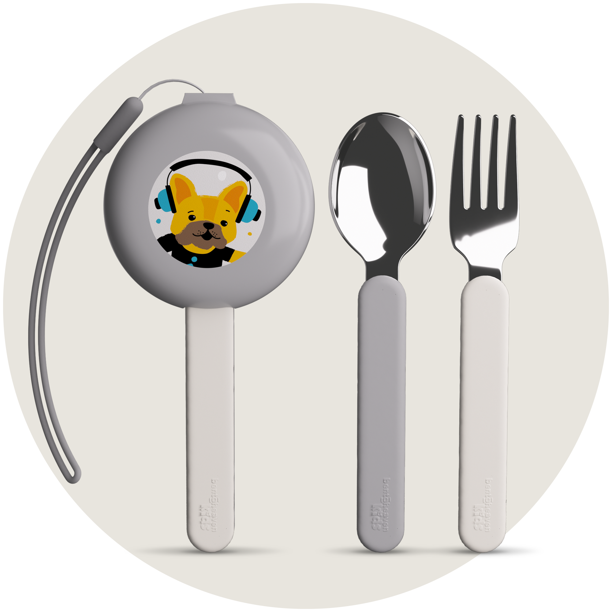 Make lunchtime on-the-go easy and fun! This durable stainless steel fork and spoon set comes in a clever, compact case that keeps utensils clean before meals and contains messes after. The handy loop attaches to any lunch bag, so they always make it home.