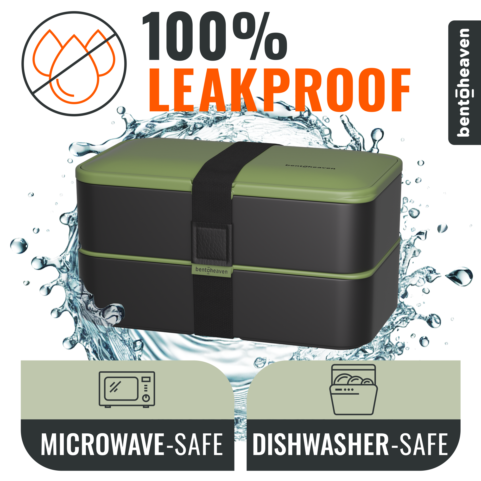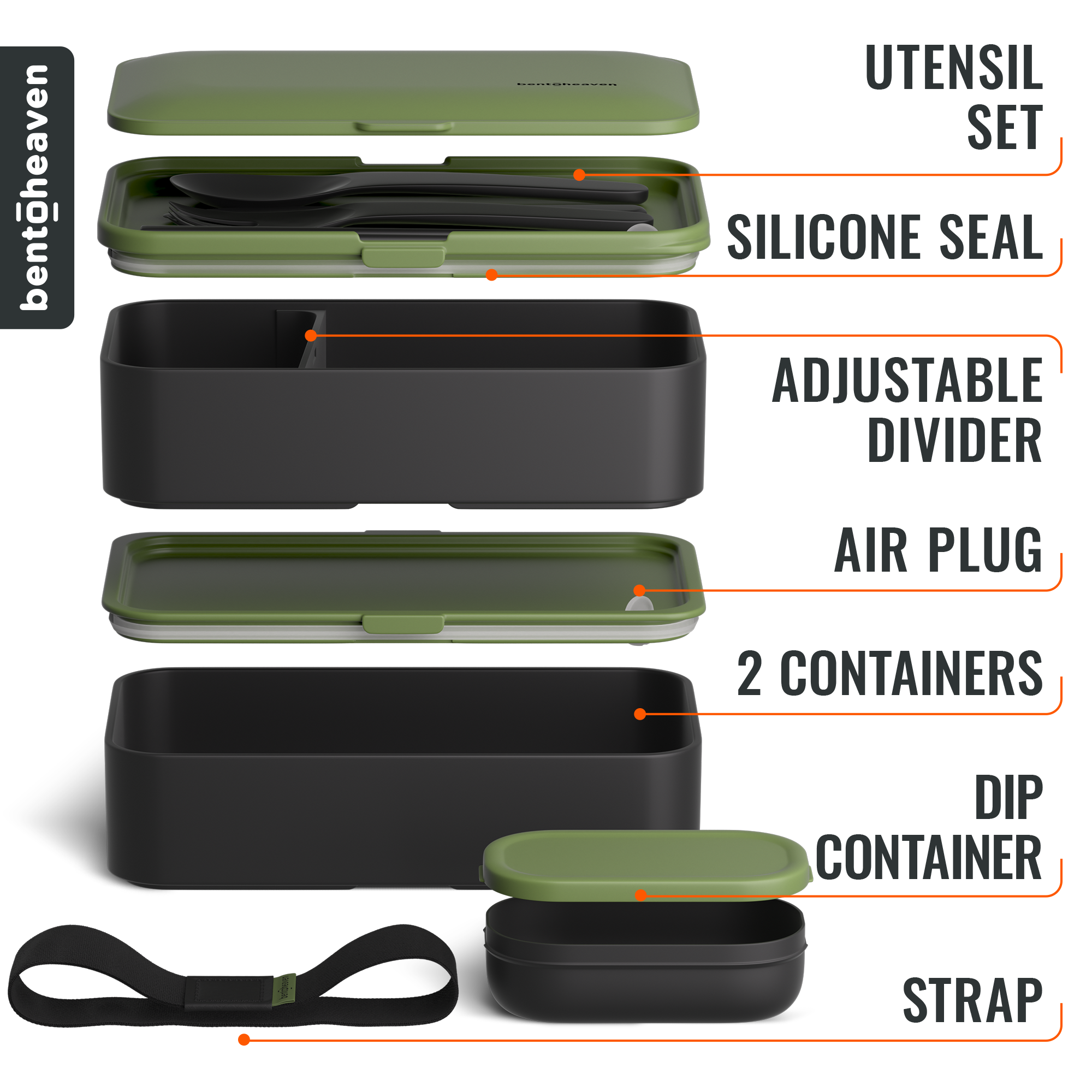 - Included in the Box: 2 stackable containers, 2 leak-resistant lids, 1 top lid, 1 removable divider, 1 sauce cup, 1 full utensil set (fork, spoon, knife, chopsticks), 1 sealing strap.