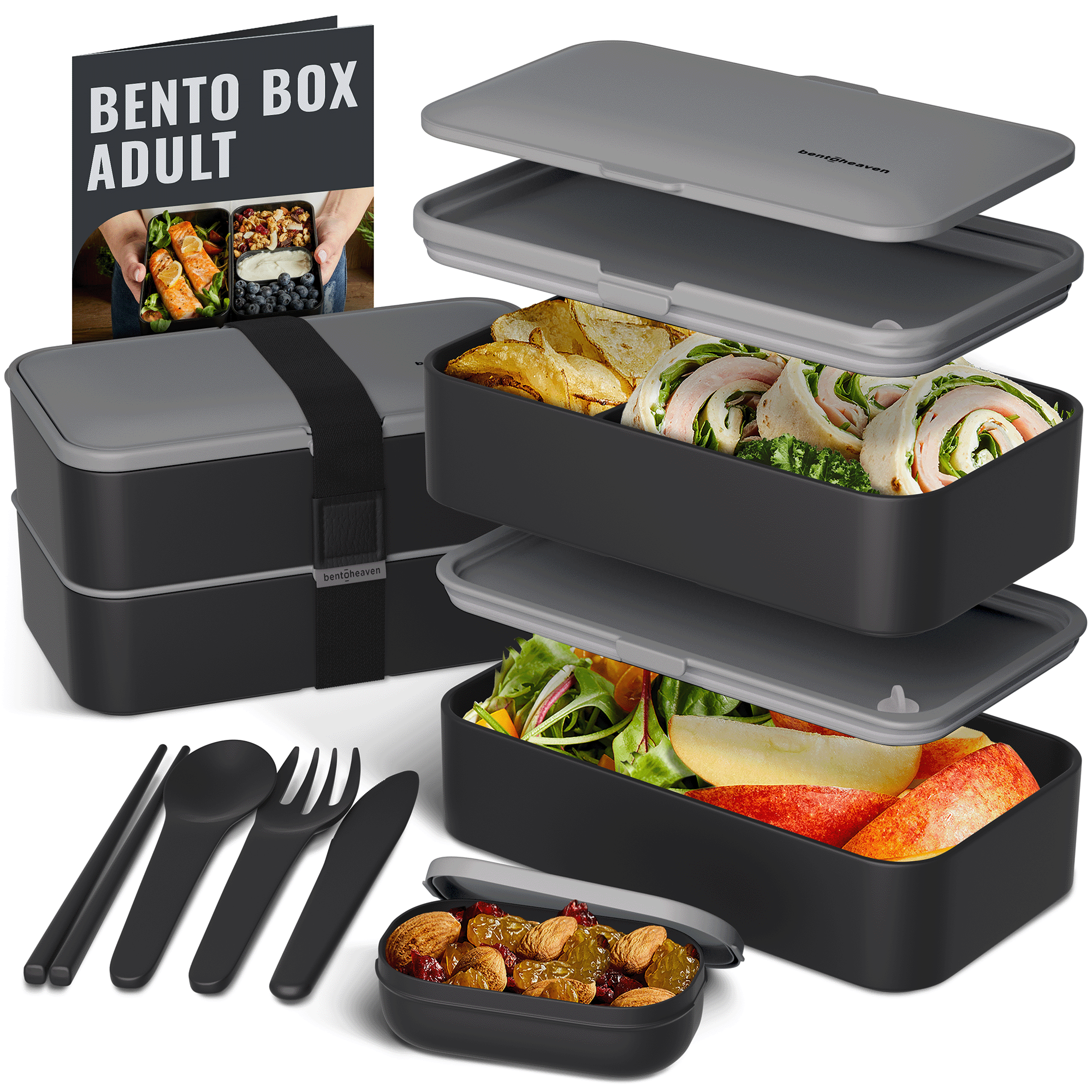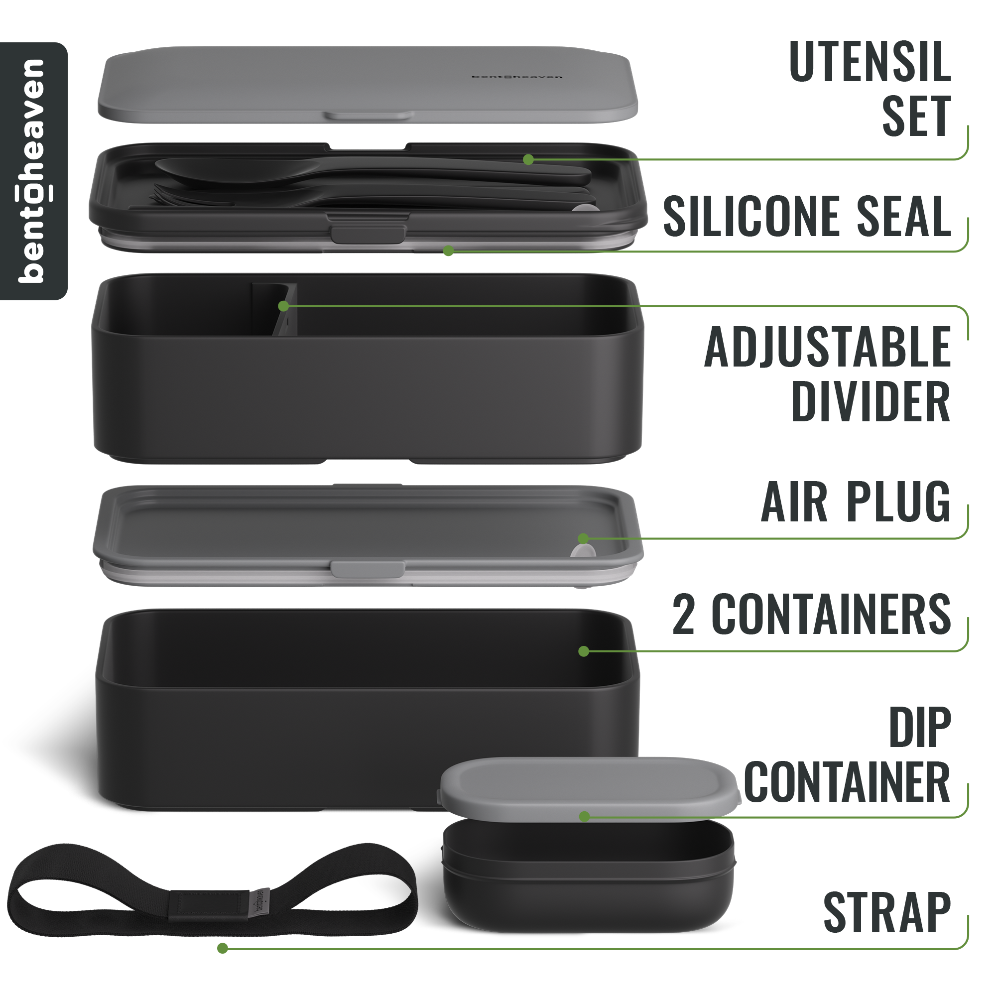 - Included in the Box: 2 stackable containers, 2 leak-resistant lids, 1 top lid, 1 removable divider, 1 sauce cup, 1 full utensil set (fork, spoon, knife, chopsticks), 1 sealing strap.