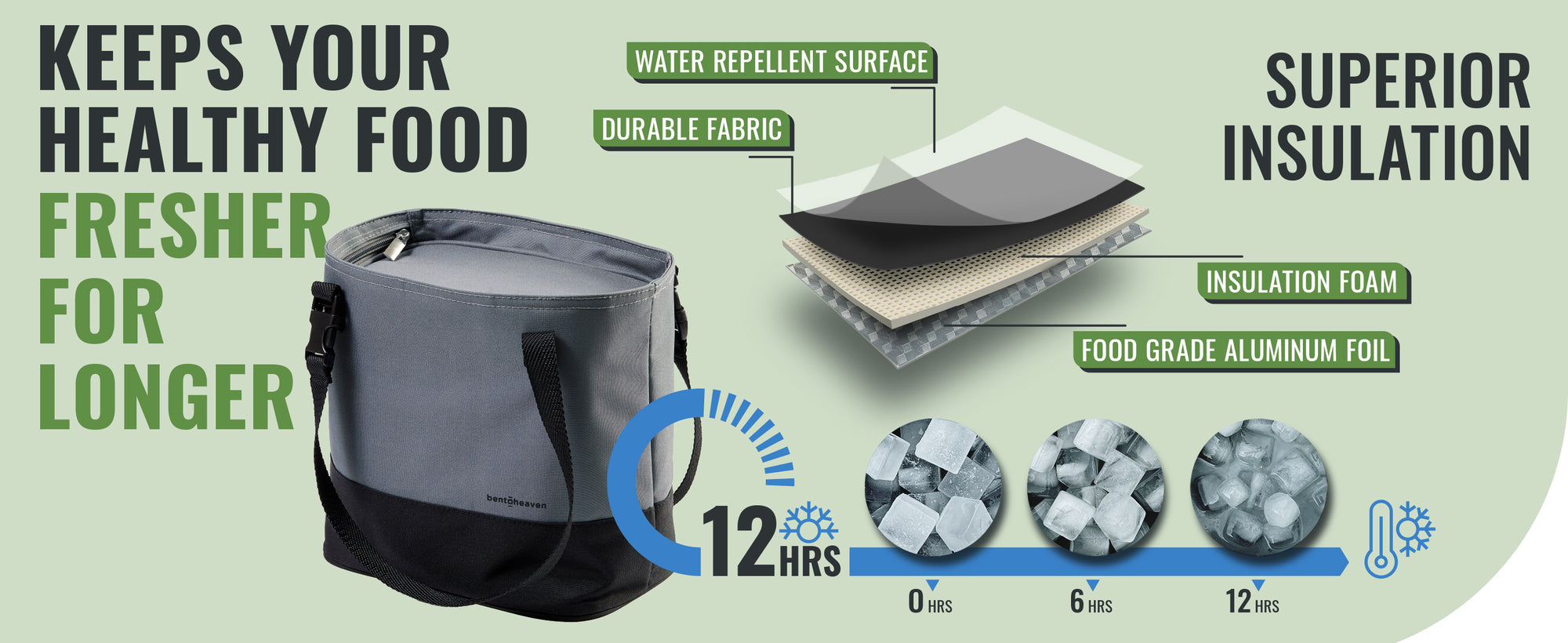 The bag’s thick insulation layer is designed to maintain your food's temperature for up to 4 hours. For the best cooling results, especially on warm days, we highly recommend adding an ice pack in the convenient inner mesh pocket, which will extend the cooling time significantly.
