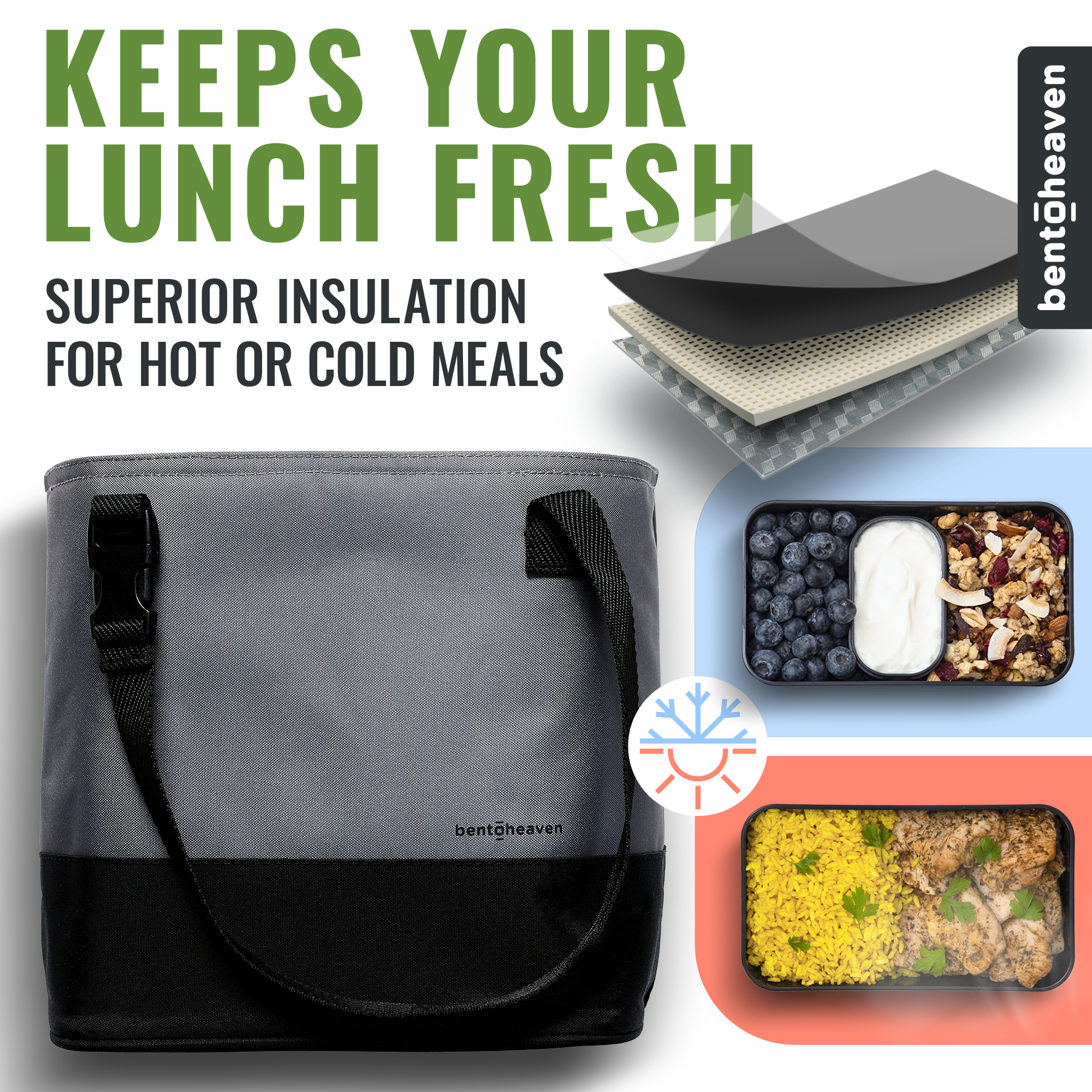 The bag’s thick insulation layer is designed to maintain your food's temperature for up to 4 hours. For the best cooling results, especially on warm days, we highly recommend adding an ice pack in the convenient inner mesh pocket, which will extend the cooling time significantly.