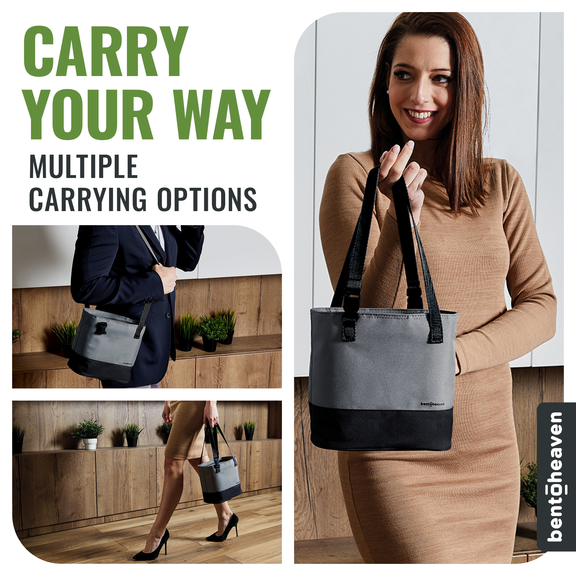 Designed for a snug, secure fit with the Bentoheaven bento box, our tote leaves extra room on top for a drink or snacks. The "go tall, not wide" shape is also a favorite for carrying multiple drink cans, travel mugs, or even stacking rectangular glass containers. The wide-opening top makes packing, unpacking, and cleaning effortless.